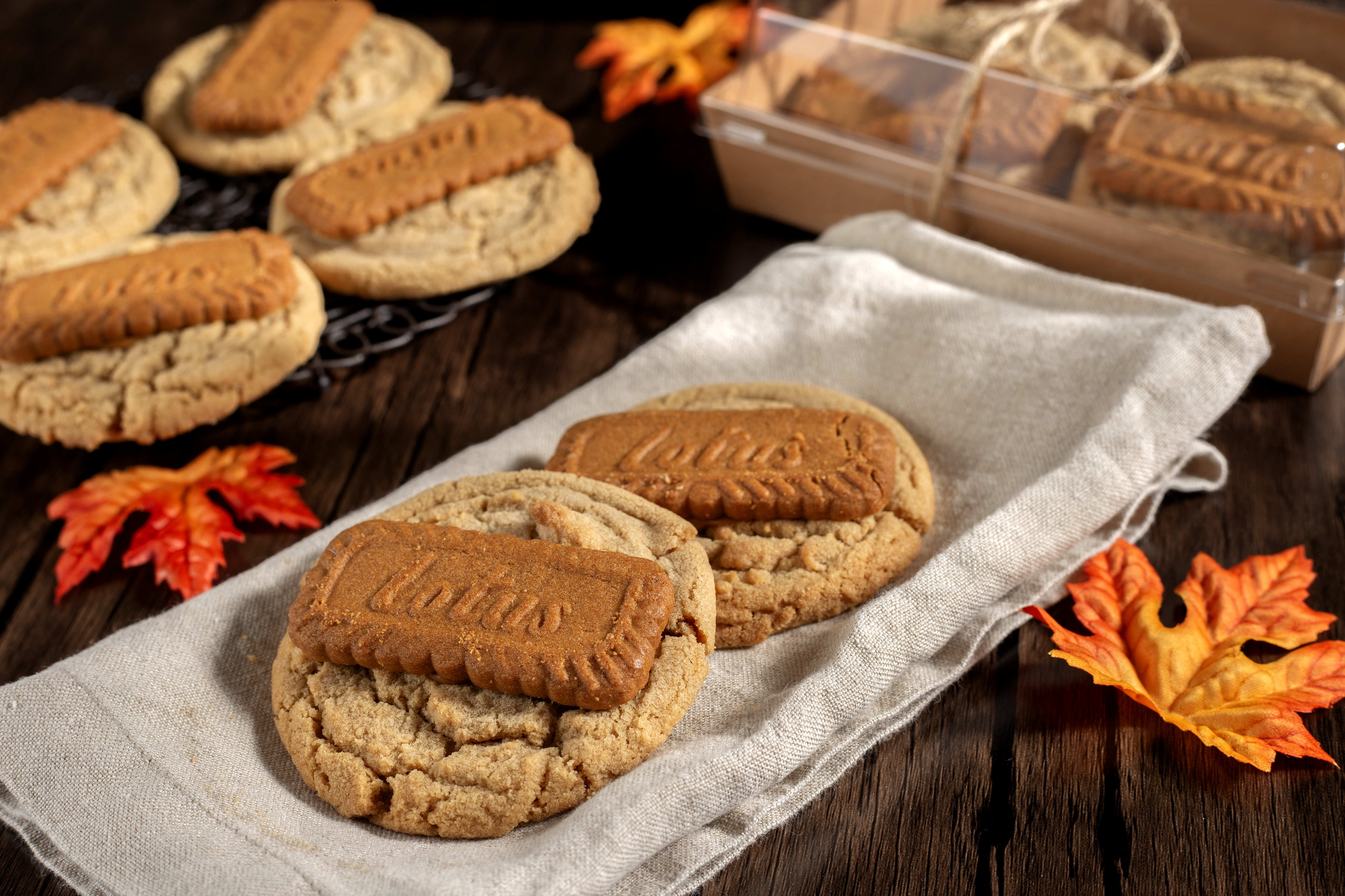 - Bake for 10–11 minutes. Once removed from the oven, gently press a Biscoff cookie into the center of each warm cookie butter cookie. Allow them to rest on the baking sheet for 5 minutes.