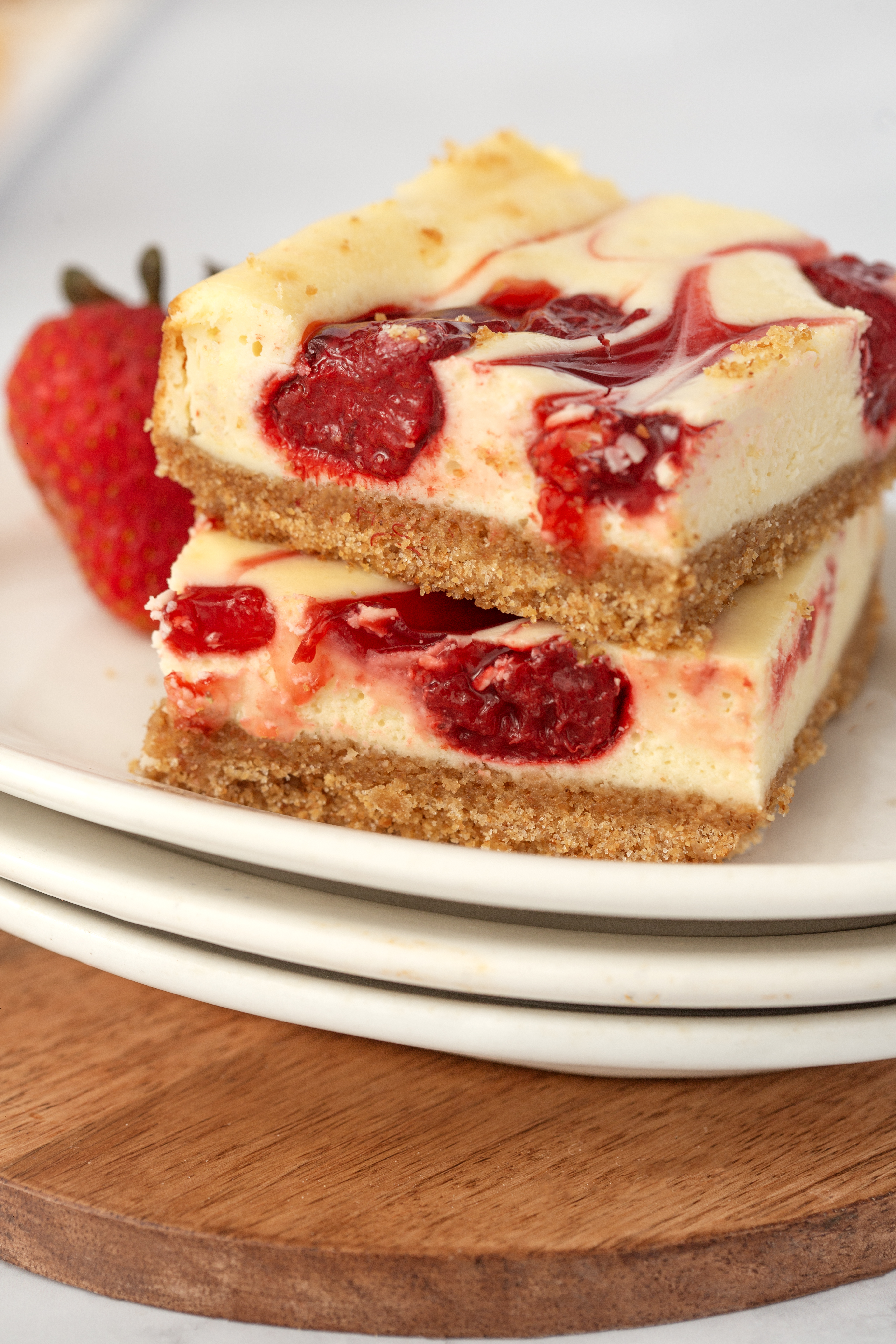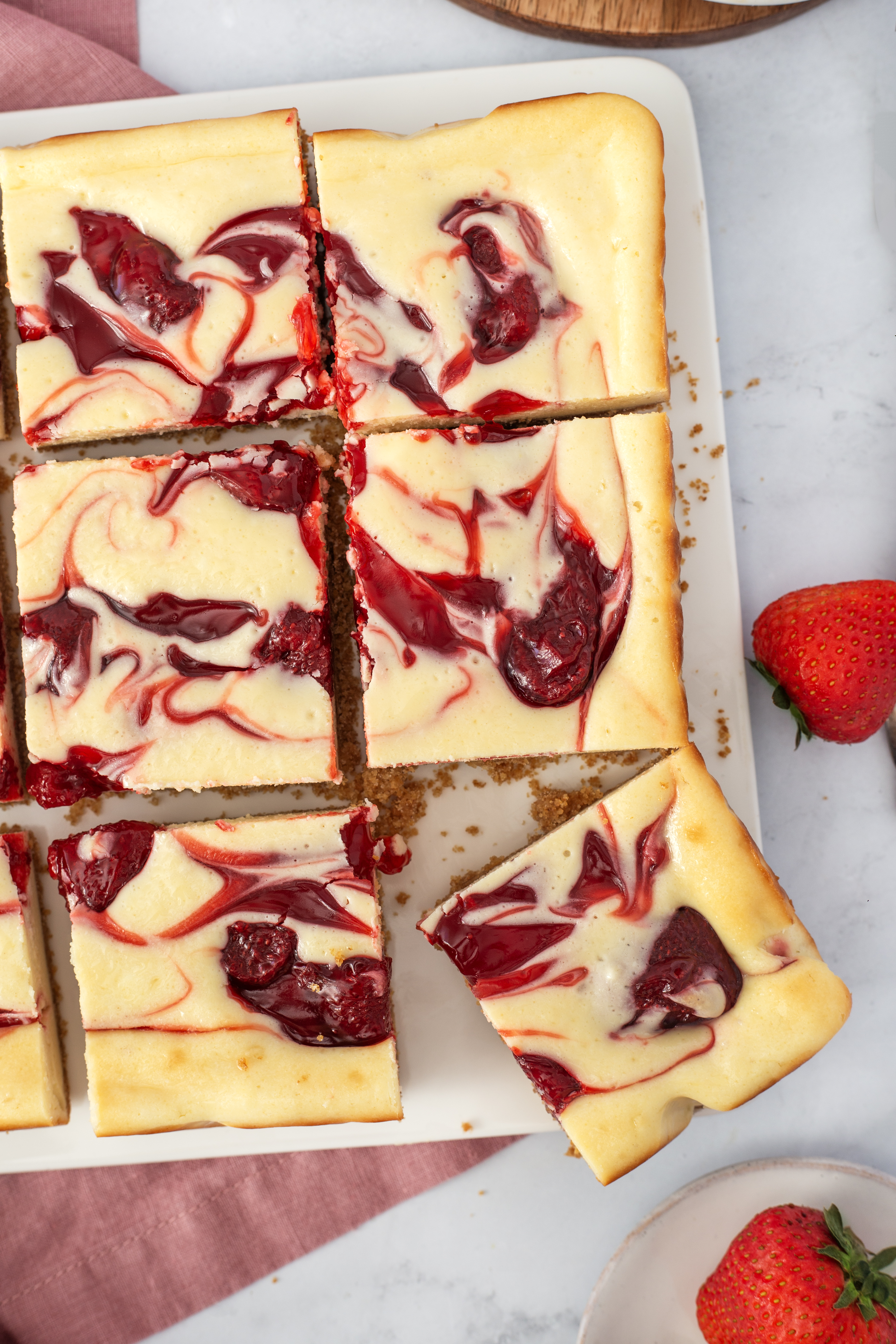 From the moment you line your baking pan with parchment paper to the final slice, every step in creating these cheesecake bars is filled with anticipation. Whether it’s the buttery base of the graham cracker crust, the rich creaminess of the cream cheese mixture, or the vibrant strawberry swirls that sit so prettily on top, each element comes together to celebrate the season’s bounty. With your electric mixer at the ready, you’ve beaten, swirled, and baked your way to a perfect dessert that’s as beautiful to look at as it is delicious to eat.